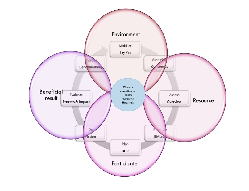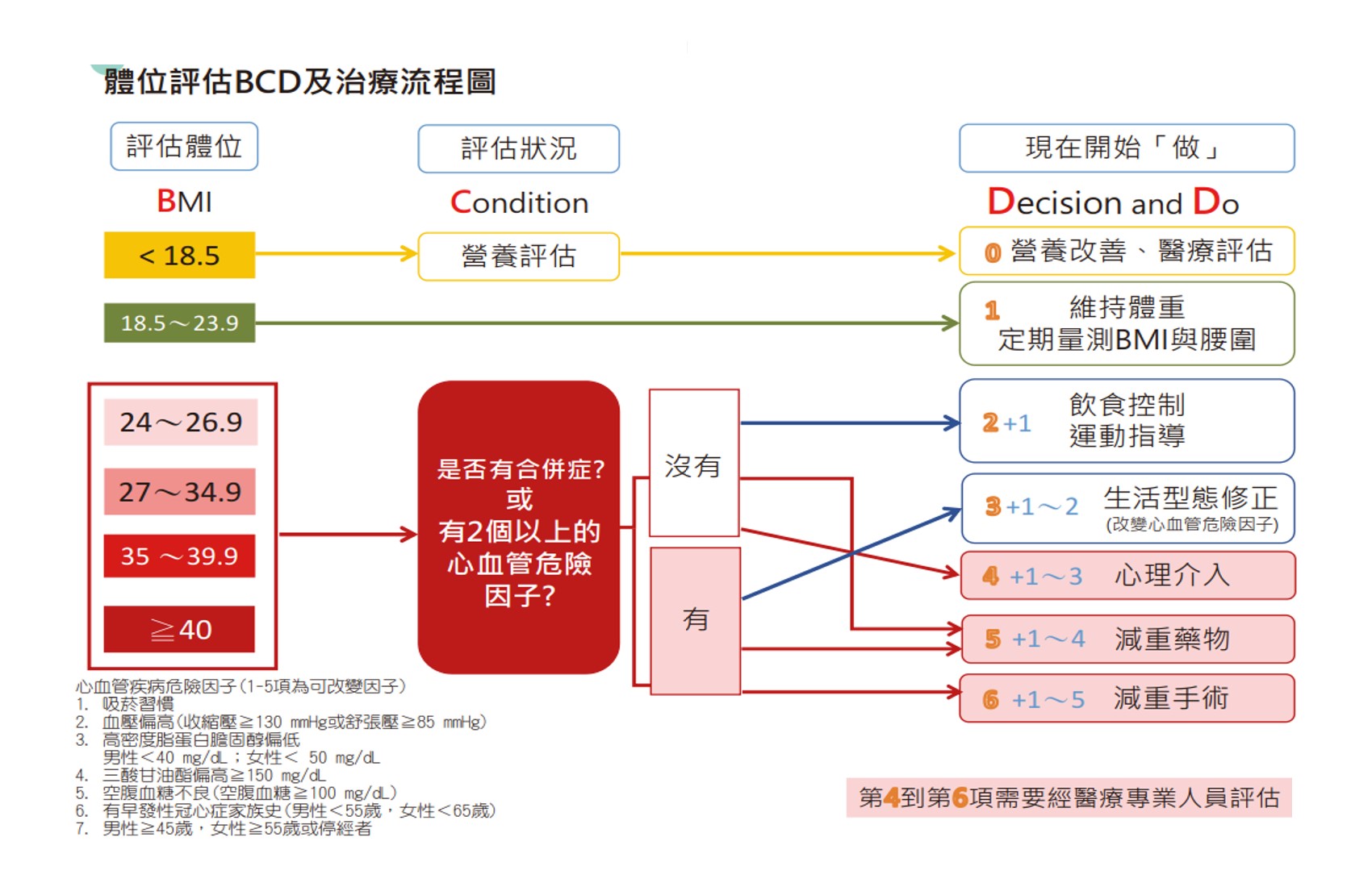 依據成人肥胖防治實證指引中的BCD流程,利用職場周全健康促進推動模式以八大步驟導入發展出適合門診、住院及員工的BCD流程!