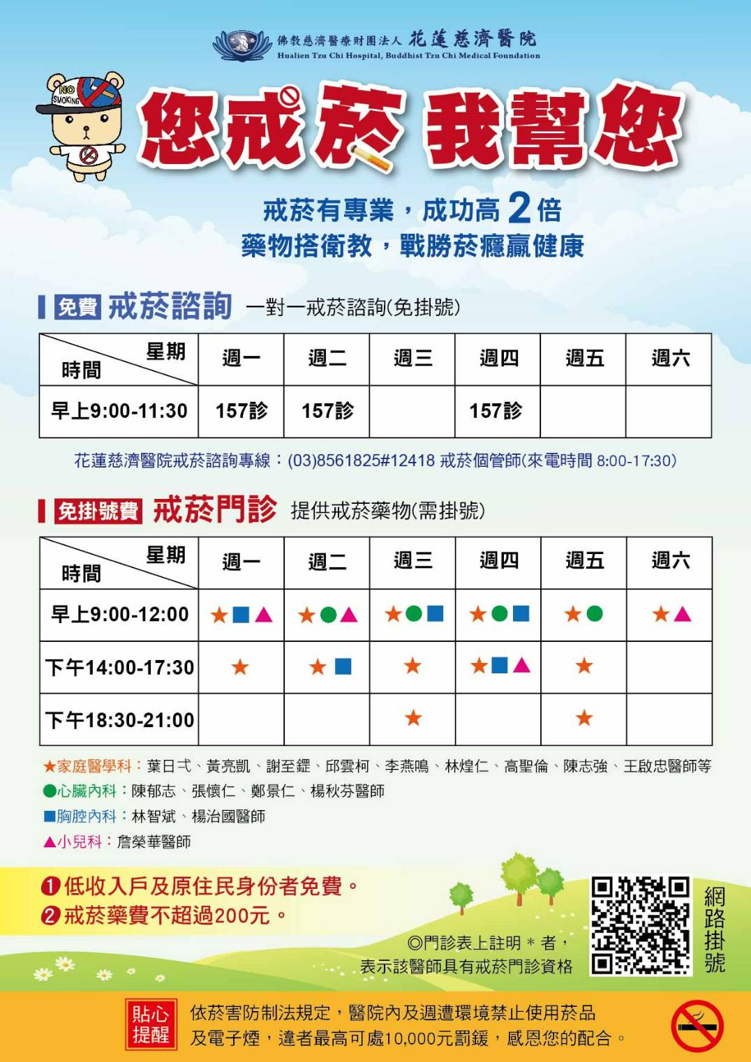 本院有完善的門診、住院戒菸服務,並於大廳一樓157診間設立戒菸諮詢室,提供來院戒菸個案獨立、隱私的衛教空間。