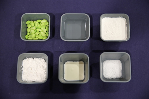 「毛豆大福」製作方法十分簡單,所需材料有:製作成大福皮的糯米粉、太白粉、冷水,與製作內餡的生毛豆仁、鮮奶油、糖和鹽。先將糯米粉與冷水拌勻成糰狀,並打開電鍋外鍋加水預熱,待電鍋中充滿蒸氣,放入電鍋中蒸煮約三分鐘,後取出鍋中拌勻,再放入鍋中蒸至透明狀,放涼後外皮即完成。內餡則是將毛豆仁煮約五到十分鐘後,去除毛豆外層的薄膜,再把去膜的毛豆放入果汁機或食物調理機,加入鮮奶油和糖,攪打至泥狀。最後使用太白粉鋪在盤子,再放上放涼的大福皮,每十至十五公克分為一團,並桿平,取約十克的毛豆泥放在大福皮上,包裹後再搓圓就製作完成。
