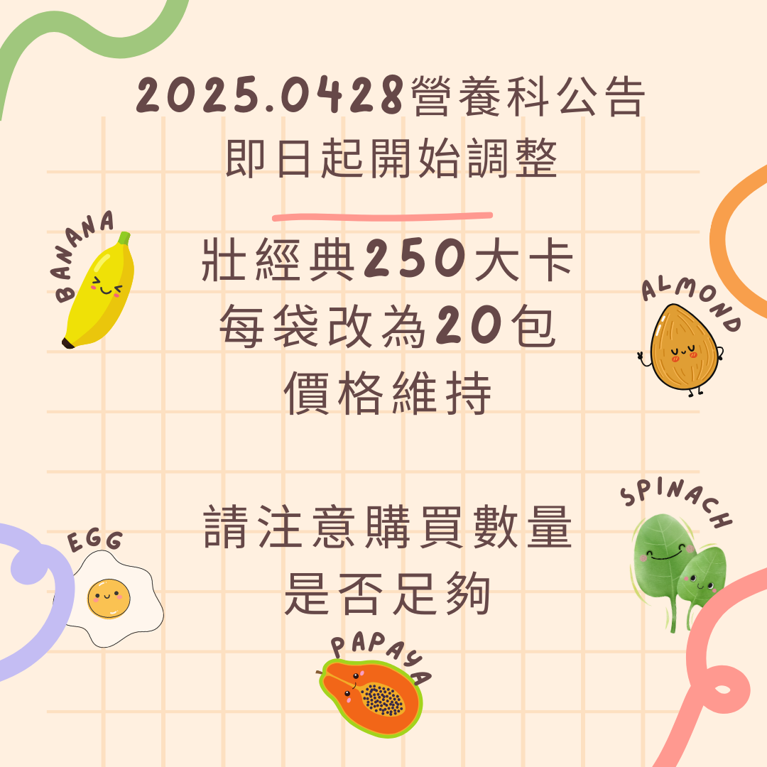 下一篇文章: 營養品規格調整-壯經典300大卡改為1袋20包