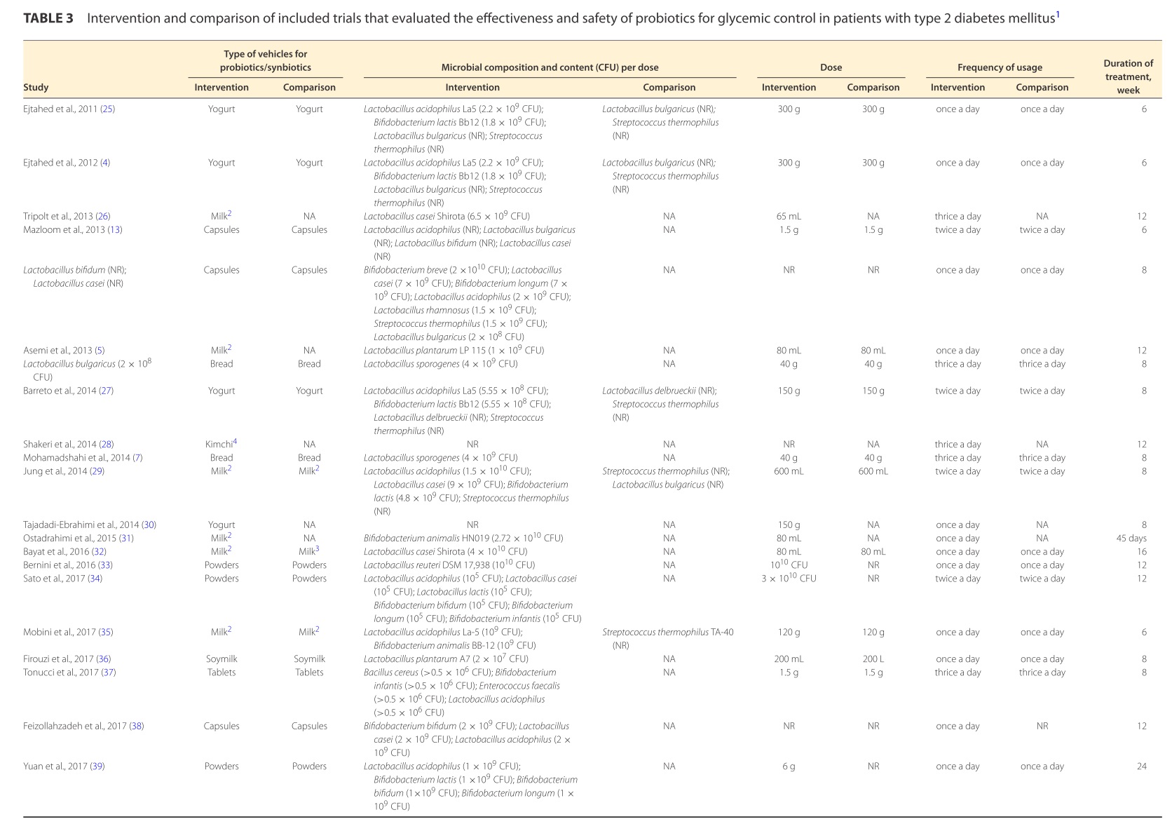 本文章通過電子檢索,納入2011至2019年間發表的28項RCT,隨訪時間為6週到9個月,共包括1947名參與者,每個試驗參與人數從24~234人不等,一半參與者(1031,53%)是從中東招募,年齡35~76歲不等,所有參與者都被診斷為糖尿病前期或第二型糖尿病(1-26年)且都體重超重;所有T2DM參與者都接受了口服降糖藥物治療,其中1/3有接受額外的胰島素治療。