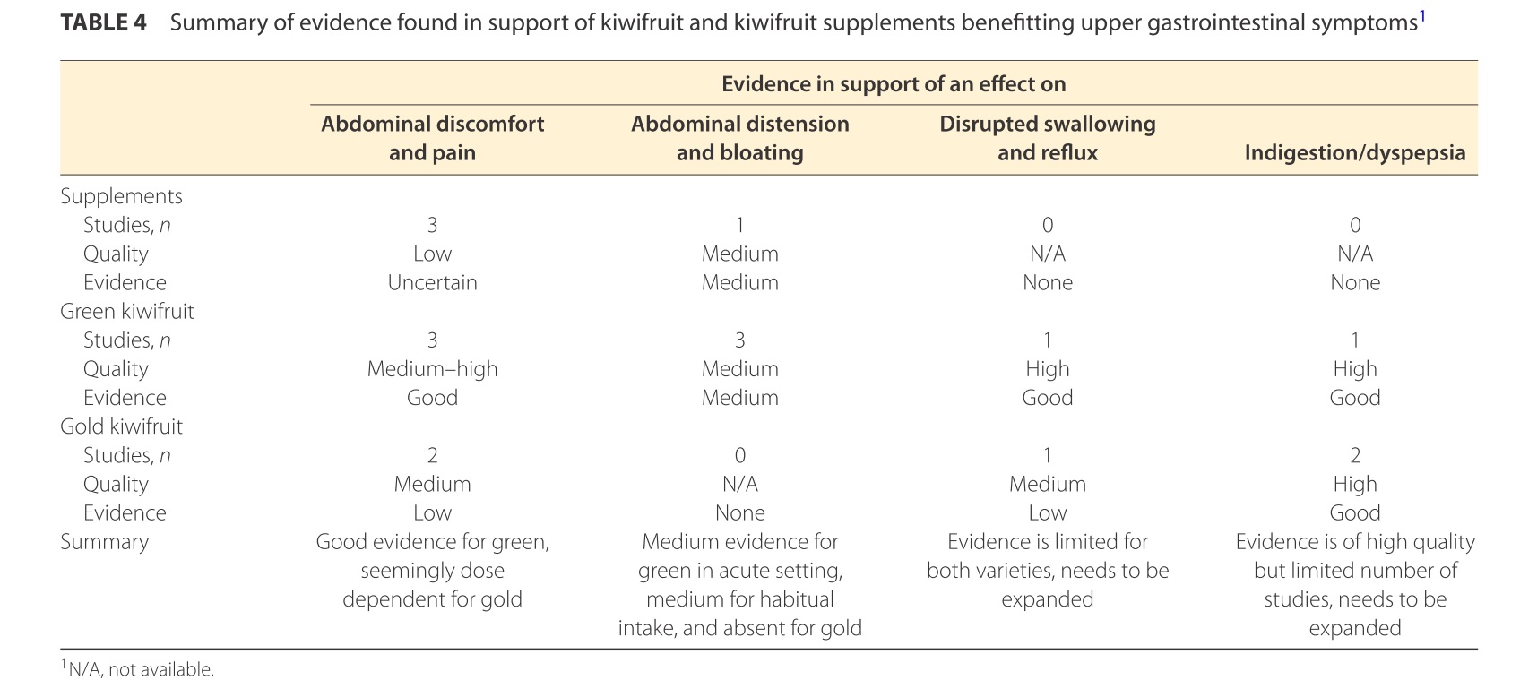 已知奇異果有幫助消化的作用。在使用奇異果改善便秘的臨床介入試驗中,上消化道 (GI) 症狀(如腹部不適和疼痛、消化不良和胃食道逆流)也得到了緩解。此篇回顧研究旨在評估奇異果對有功能性便秘 (FC)、便秘型腸易激綜合徵 (IBS-C)的患者和健康者在緩解上消化道症狀的療效是否有差別,並闡明哪些症狀可以通過攝入奇異果來緩解,以及比較黃金奇異果和綠色奇異果的效果是否存在差異