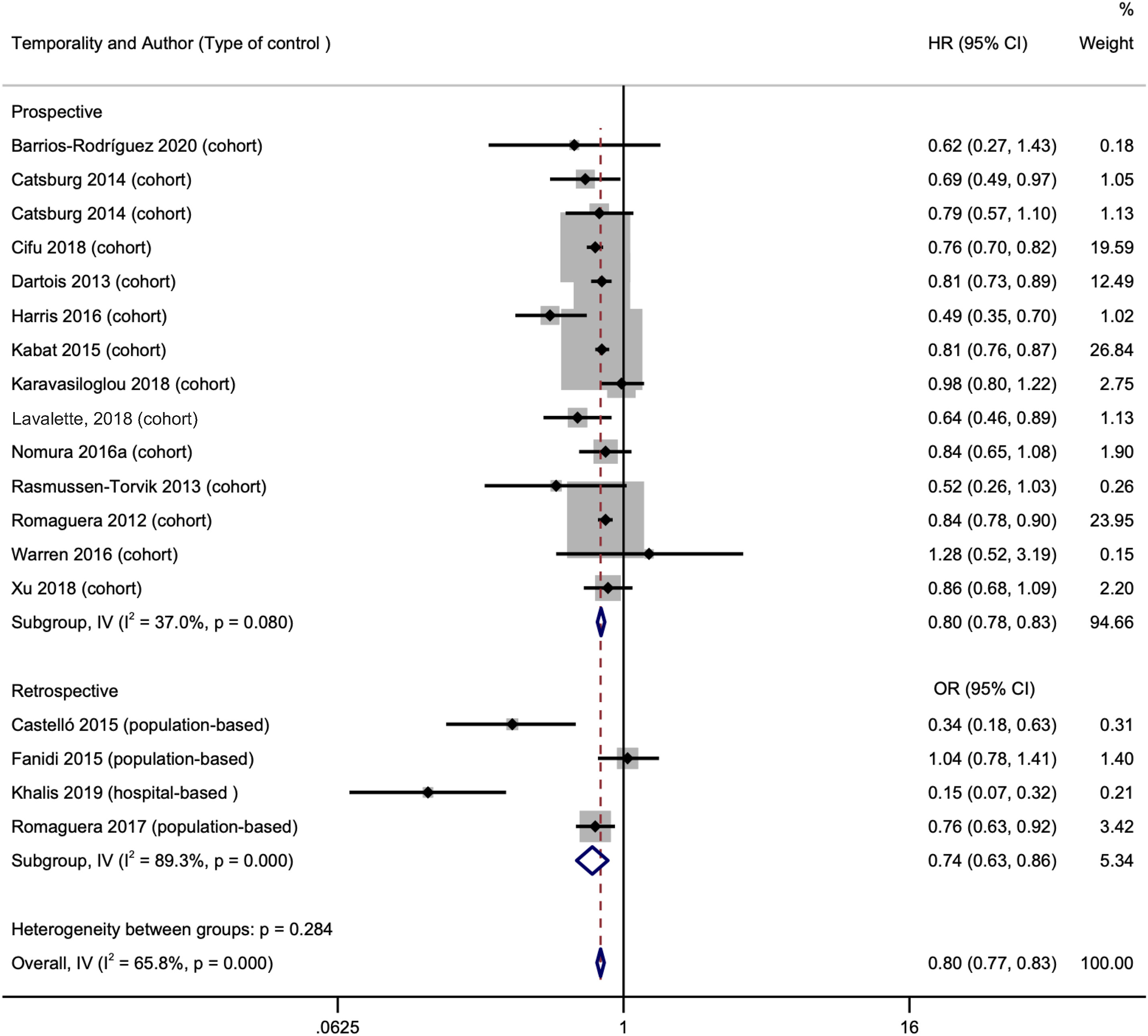 《Advances in Nutrition》在2023年7月刊登的一篇以系統性文獻回顧(Systematic Review)及統合分析(meta-analysis),探討評估健康生活方式指數和 乳腺癌風險關聯的研究匯總。研究使用: PubMed、LILACS、CINAHL 和 Science Direct等四個資料庫進行搜索,納入了2000年1月至2022年2月發表的前瞻性研究和回顧性研究,有31 項研究納入系統性回顧,29 項研究納入統合分析。結果發現前瞻性研究的總體 HR 為 0.80(95% CI:0.78,0.83),表明與最低的相比,堅持健康生活方式指數最高的人可能會減少 BC 病例,對於回顧性研究,總體勝算比(OR)為0.74(95% CI:0.63,0.86),按絕經狀態分層時,負相關仍具有統計學顯著性。此外,發現分子亞型雌激素受體 (ER+)/孕激素受體 (PR+)呈負相關:HR = 0.68 (95% CI: 0.63, 0.73),ER+/PR-:HR = 0.78 (95% CI: 0.67, 0.90)和 ER-/PR-:HR = 0.77(95% CI:0.64,0.92)。