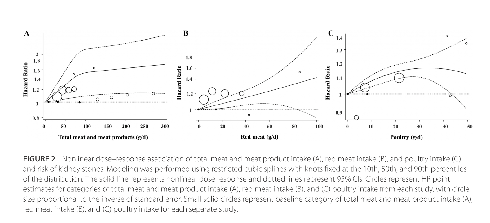 肉類和肉製品總攝取量 (A)、紅肉攝取量 (B) 和家禽攝取量 (C) 與腎結石風險之間的非線性劑量反應關聯。X軸為攝取量,Y軸為腎結石風險。