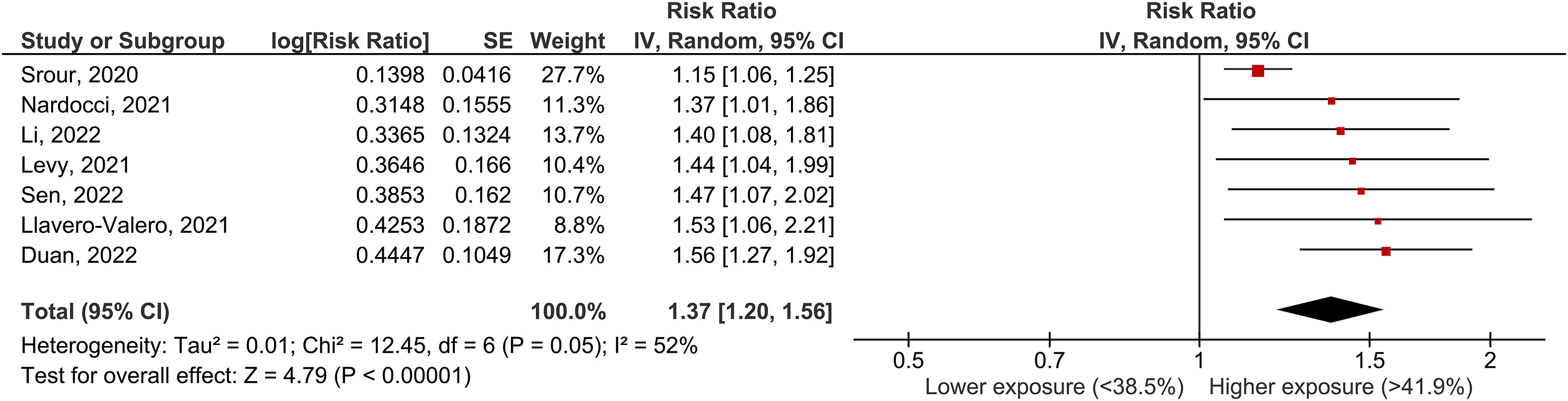 (圖一)糖尿病發生率的相關性: 最高與最低攝取量的糖尿病發生率綜合風險比(pooled RR)為1.37(95% CI:1.20,1.56),其中存在中等異質性(I2 = 52%,P = 0.05)。