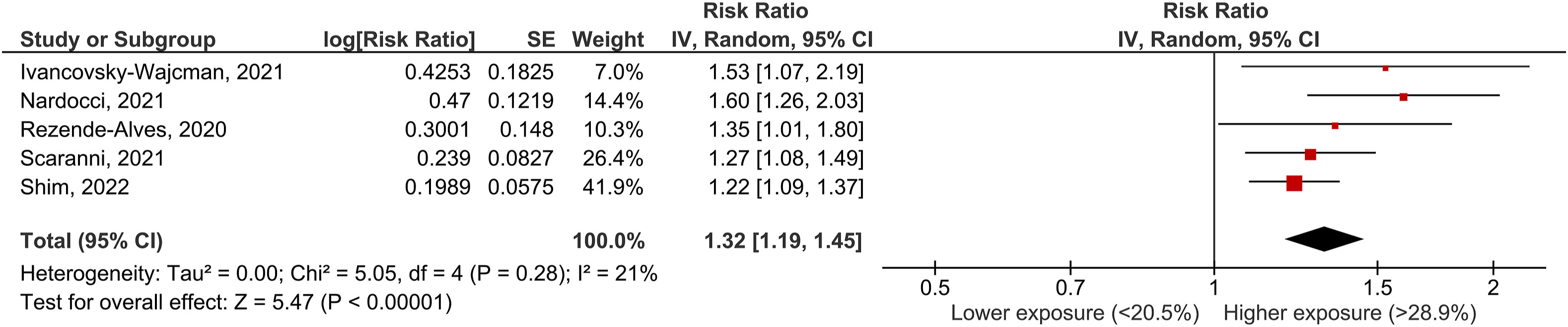 (圖二) 高血壓發生率的相關性:最高和最低加工食品的高血壓發生風險比(pooled RR)為1.32(95% CI:1.19,1.45),而且異質性不明顯(I2 = 21%,P = 0.28)