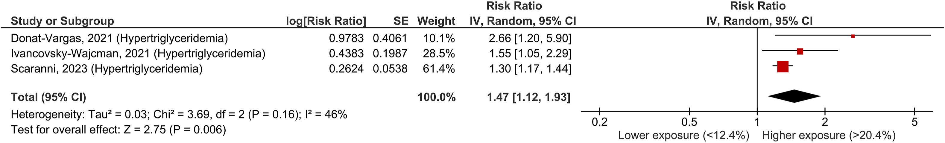 (圖三) 高三酸甘油脂發生率的相關性: 消耗最高類別相對於最低類別的高三酸甘油脂血症發生風險比為1.47(95% CI:1.12,1.93),而且異質性不明顯(I2 = 46%,P = 0.16)