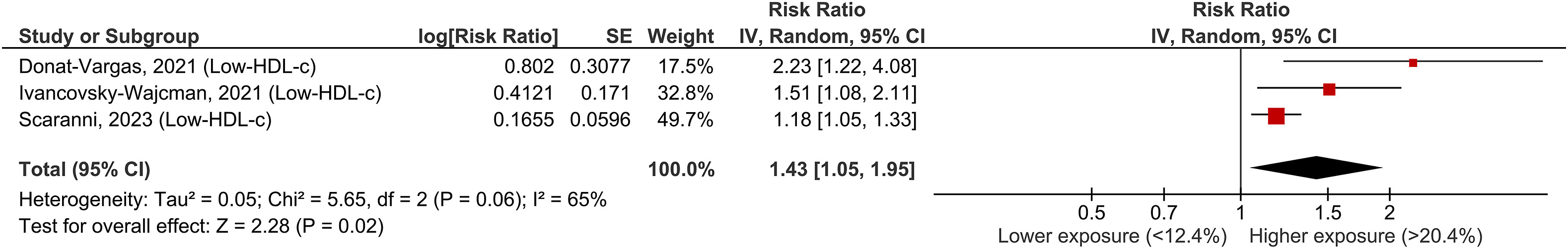 (圖四) 低HDL膽固醇發生率的相關性: 消耗最高類別相對於最低類別的低高密度脂蛋白膽固醇發生風險比為1.43(95% CI:1.05,1.95),而且異質性在統計上是顯著的(I2 = 65%,P = 0.06)