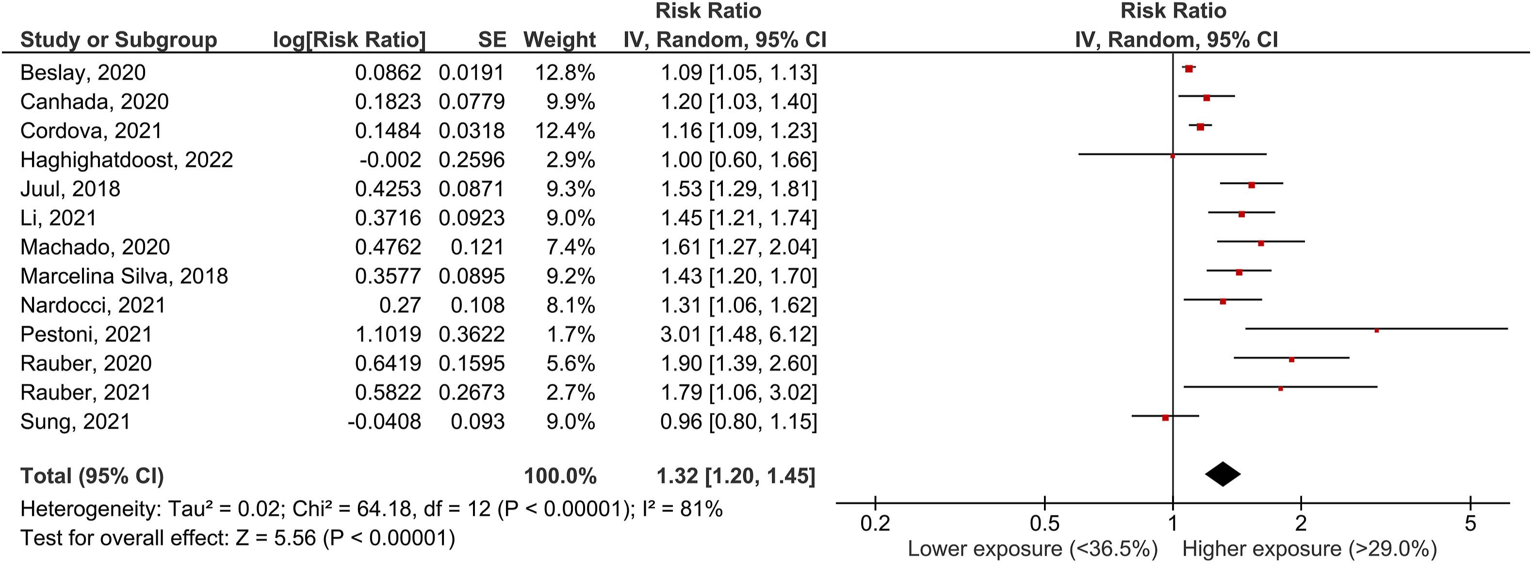 (圖五) 肥胖發生率的相關性:最高類別相對於最低類別的肥胖發生風險比為1.32(95% CI:1.20,1.45),並且異質性很大(I2 = 81%,P < 0.0001)