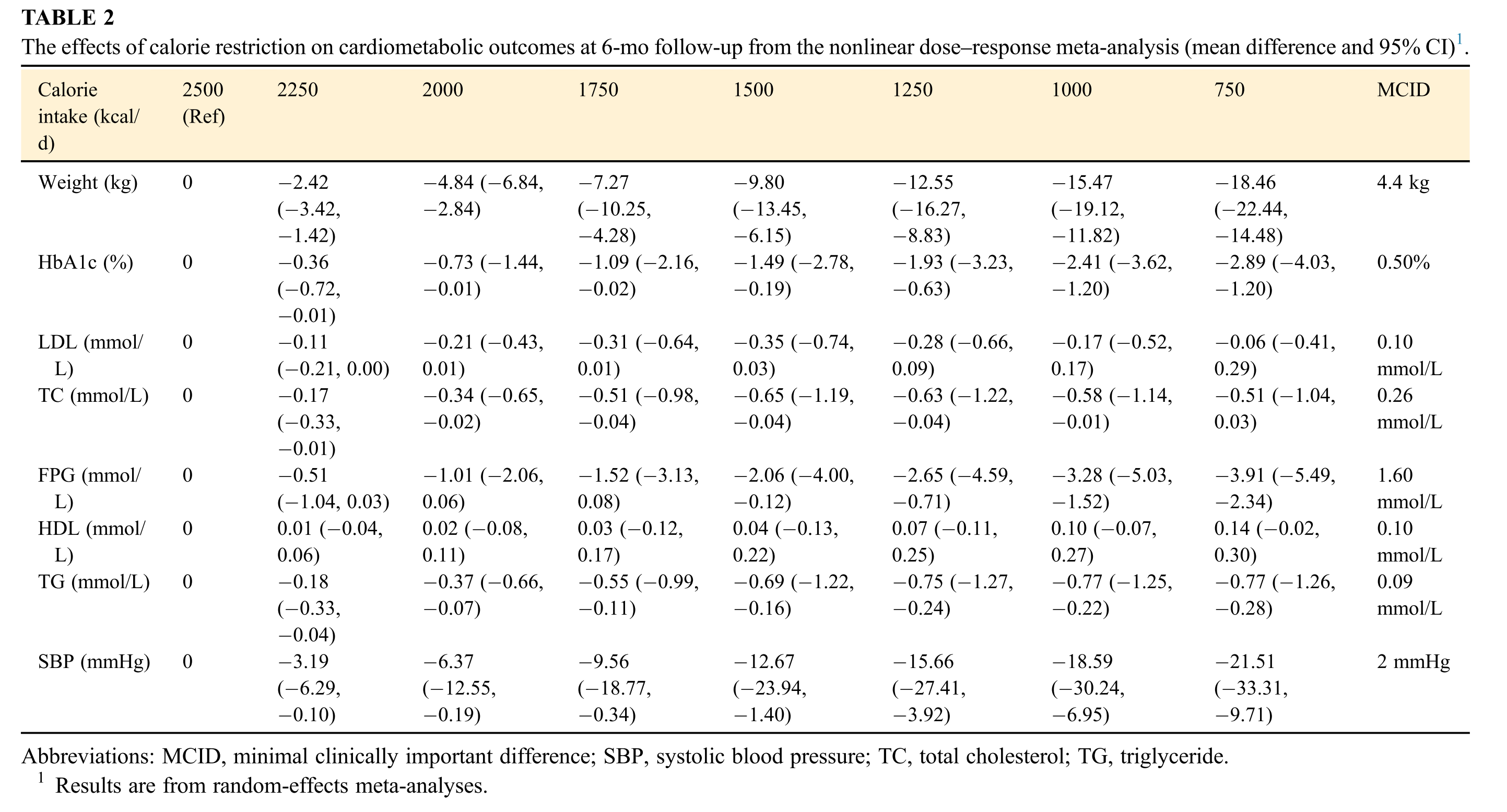 被納入分析中。分析內容包括 2 型糖尿病控制、體重變化、HbA1c、空腹血漿血糖 (FPG)、收縮壓 (SBP)、總膽固醇、低密度脂蛋白 (LDL)、高密度脂蛋白(HDL)或三酸甘油脂(TG)在實施極低熱量飲食(500-800kcal/d)、低熱量飲食(800–1200 kcal/d)、以及適度限制熱量飲食(1200–1500 kcal/d)後的分析結果作數據統合。