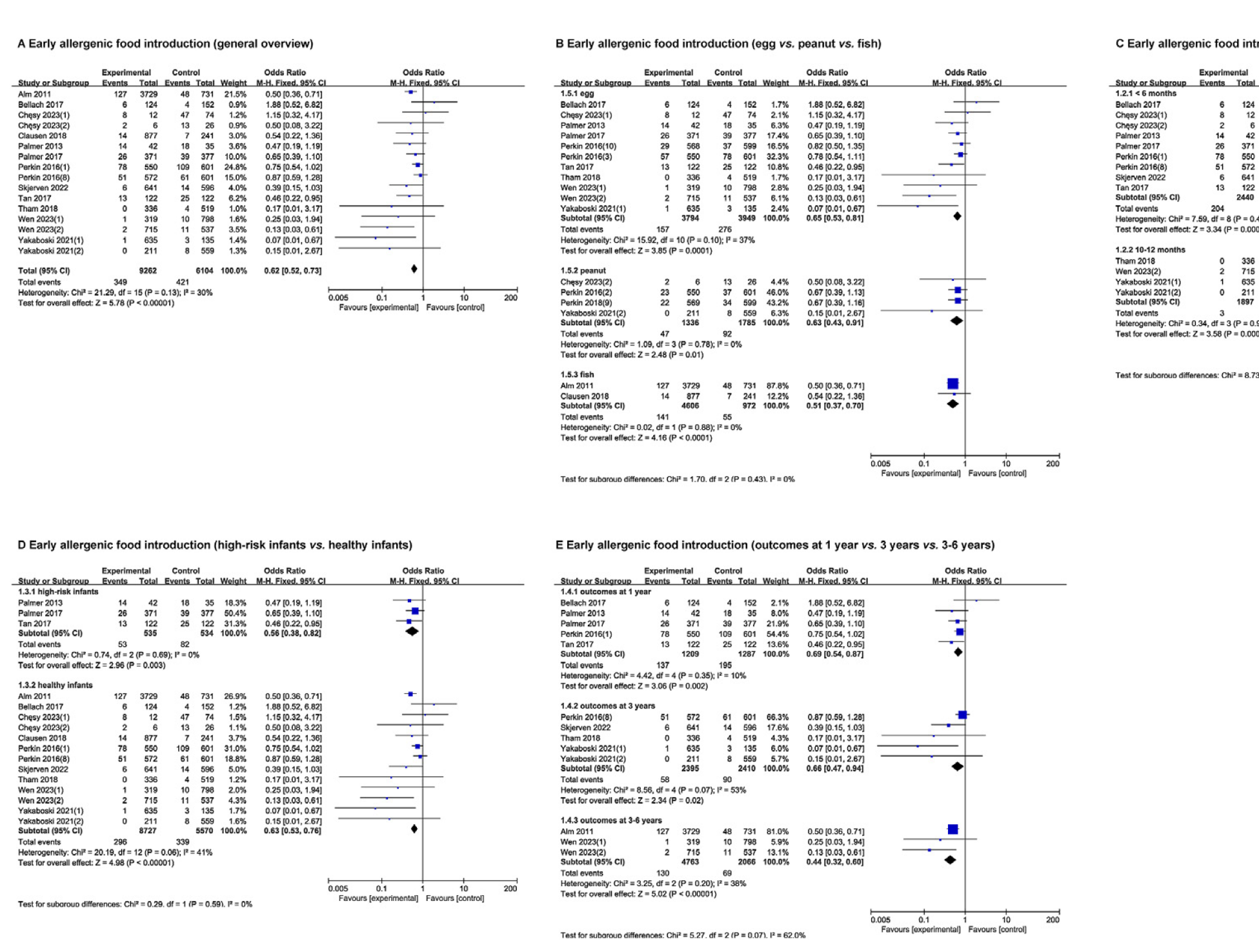 根據《Advances in Nutrition》於2023年發表的一篇系統回顧和統合分析,從 4 個資料庫(PubMed、Cochrane 圖書館、Embase 和 Web of Science)檢索相關文獻,最後納入了72篇文獻,探討早期飲食模式對兒童未來過敏性疾病的影響,統合分析的主要結果如下:
