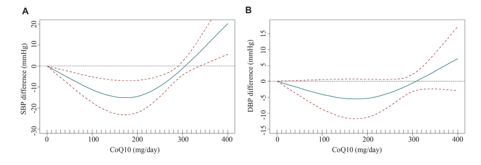 根據《Advances in Nutrition》在2022年刊登的一篇系統系文獻回顧與統合分析(systematic review and meta-analysis ),截止至2022年四月21日在三個資料庫(PubMed/MEDLINE、Embase 和Cochrane )進行全面的文獻檢索,共收納了26項研究,1831名受試者。使用限制性立方曲線模型評估CoQ10 與血壓之間的非線性劑量與效應關係。