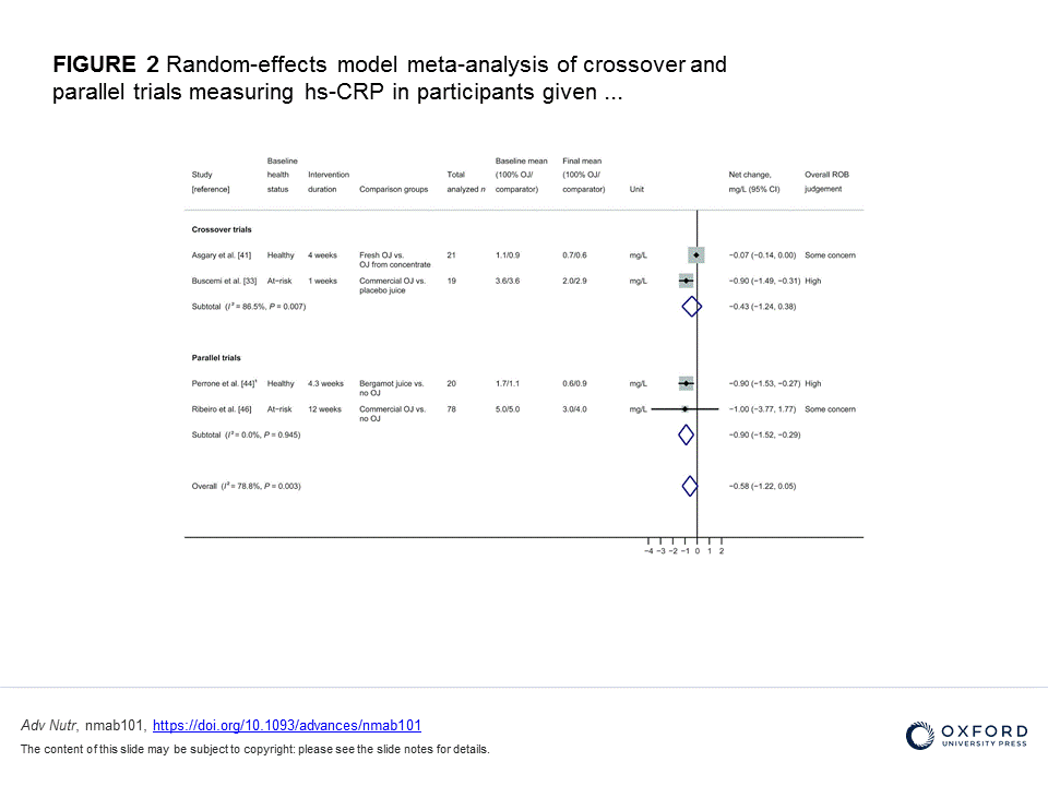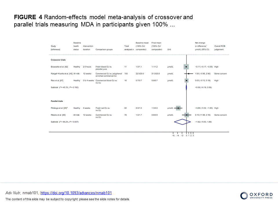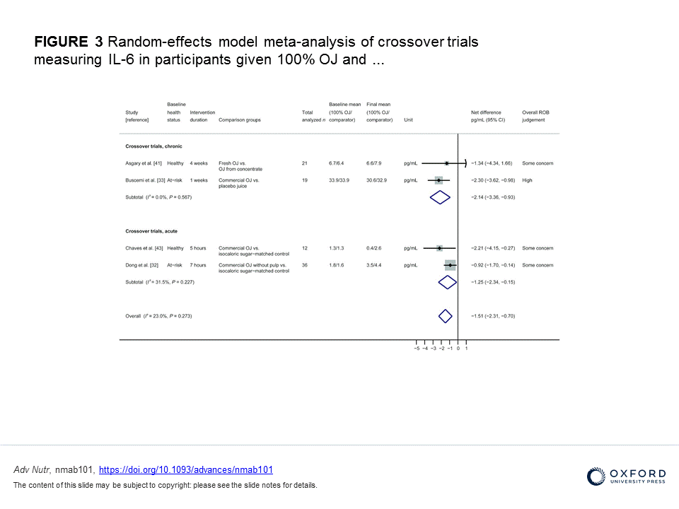 結果顯示:在攝取百分百橙汁後,不論健康或具慢性病風險參與者其IL-6濃度皆顯著性降低(pooled net difference:1.51 pg/mL; 95% CI:2.31,0.70)。hs-CRP (pooled net change:0.58mg/L;95% CI:1.22,0.05)及MDA(crossover trials pooled net difference:0.06 骴ochmol/L;95% CI:0.19,0.08)雖有下降,但不具顯著性差異。