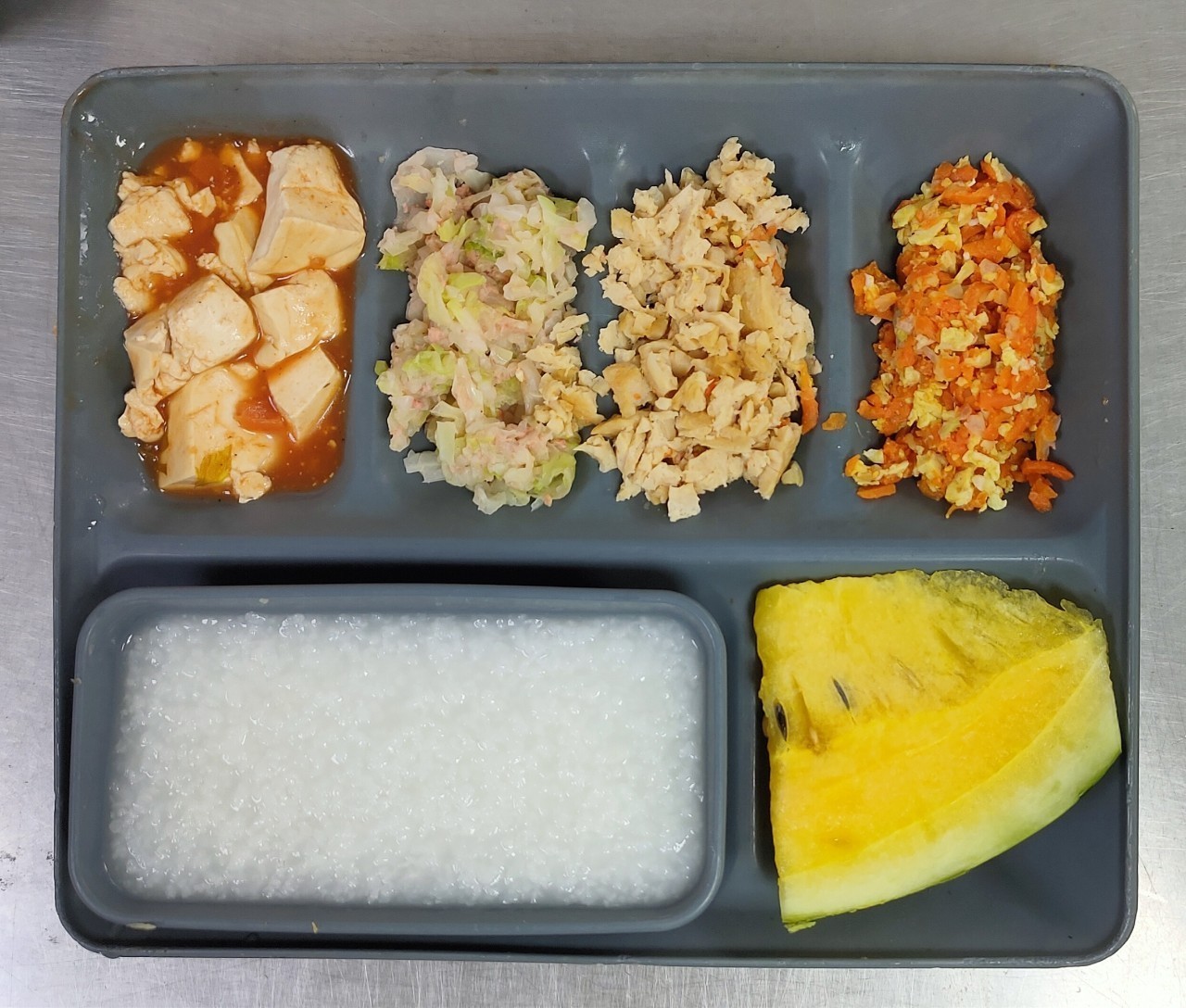 普通飲食菜色經過機械攪成細碎菜,軟質食物如(豆腐、蒸炒蛋、南瓜、茄子)直接供應。符合素食營養需求的均衡飲食。