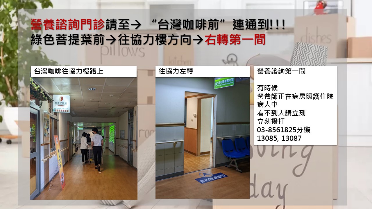 ●因營養師有時因病房業務不在診間,請打電話03-8561825分機13087/13089