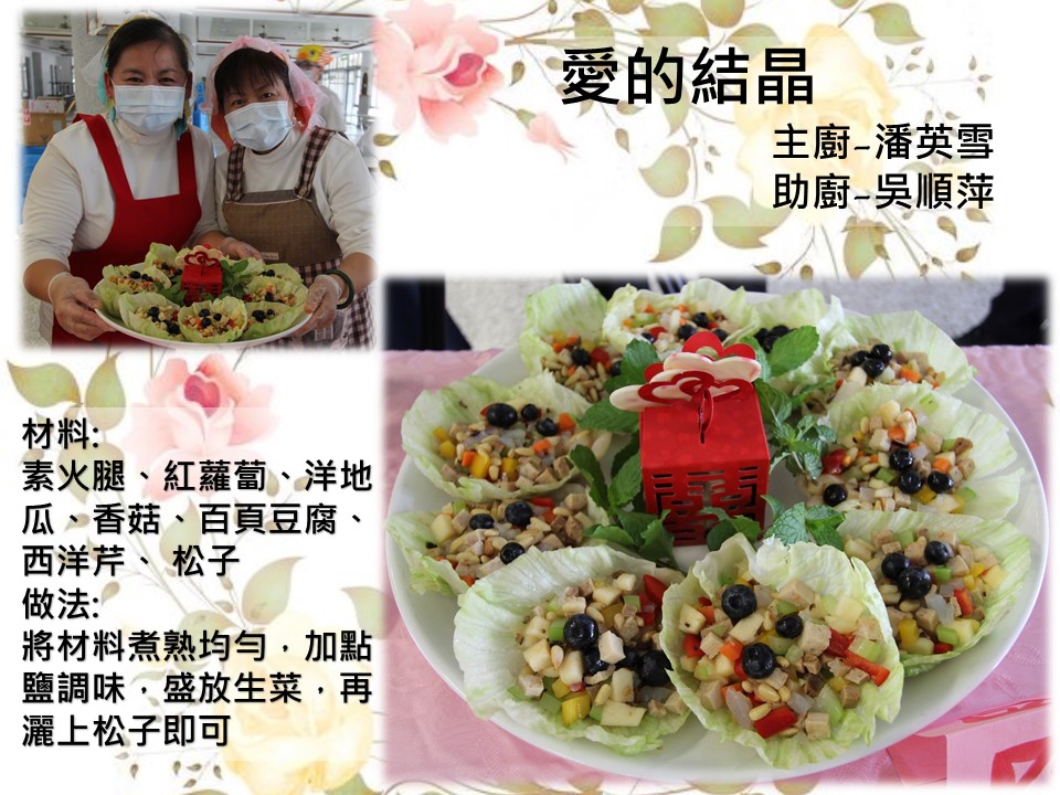 傳遞健康、尊重生命及拯救地球的觀念,花蓮慈濟醫院以實際節能減碳行動為二十七周年慶系列活動揭開序幕,舉辦「七夕情人節-慈濟盃素食點心比賽」。十三日傳統七夕情人節當天,花蓮慈院同仁們發揮專業與創意,以低碳無油的烹調方式推廣甜蜜蔬食創意料理,花蓮慈院高瑞和院長除了感恩同仁們身體力行的響應,更鼓勵同仁從蔬食、齋戒、日行一善開始,讓點滴的愛心匯聚成「善撲滿」,為地球環境的永續與健康付出一份心力。
