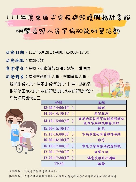 1. 活動對象:長期照護醫事人員、照顧管理人員、照顧服務人員、居家服務督導員、日照、據點活動帶領工作人員、照顧管理專員及照顧管理督導