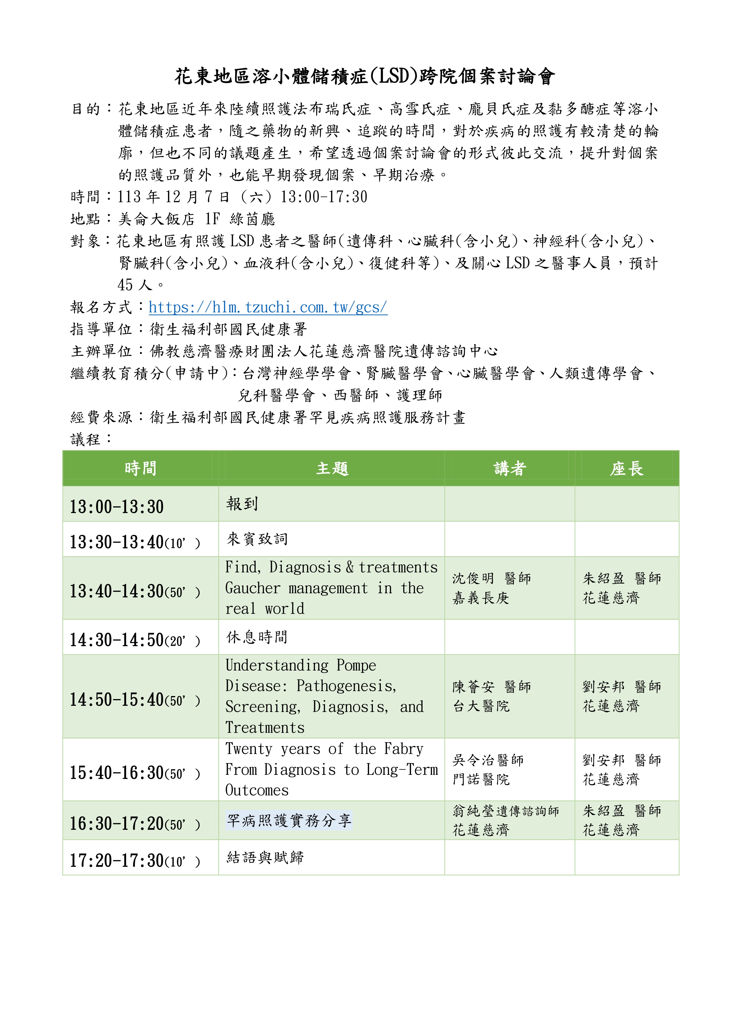 一、近年來對法布瑞氏症、高雪氏症、龐貝氏症及黏多醣症等溶小體儲積症患者之照護,隨藥物新興及追蹤時間增長,而有較清晰之認知,同時亦產生新議題。期盼透過個案討論會形式彼此交流,提升照護品質及即早發現、治療,誠邀醫事人員及有興趣者共同參與。