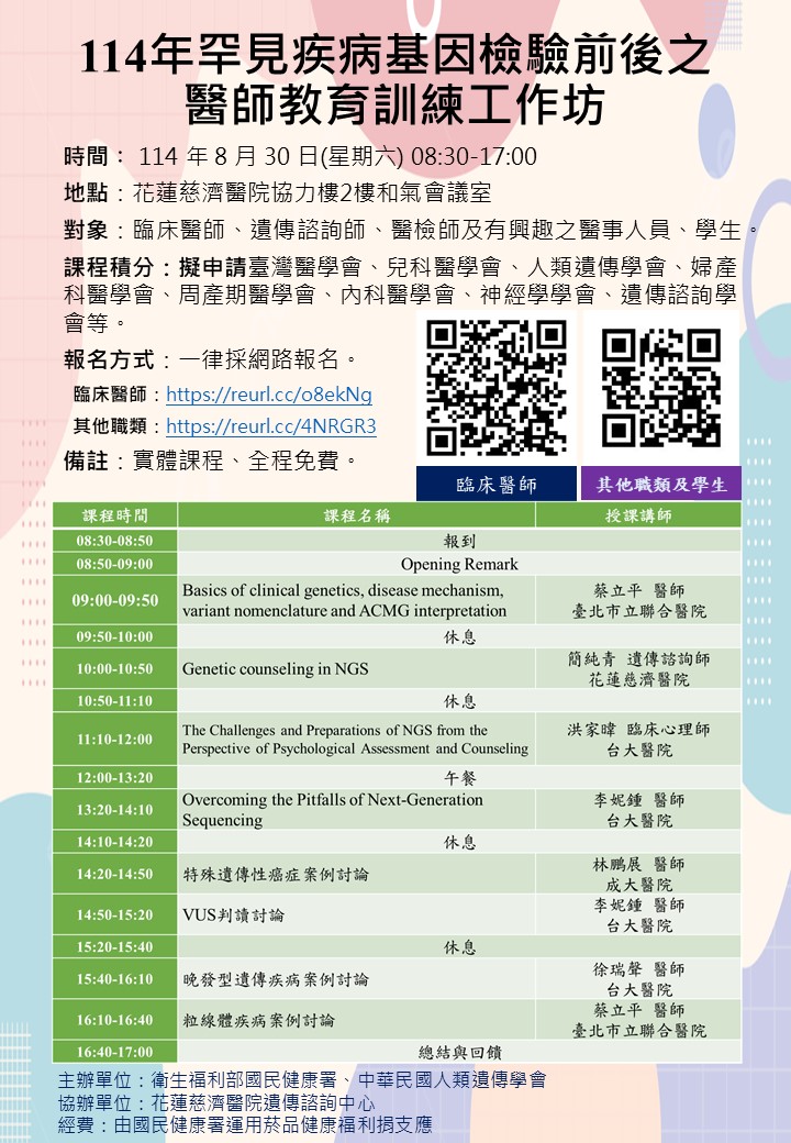 一、中華民國人類遺傳學會舉辦「罕見疾病基因檢驗前後之醫師教育訓練工作坊」,透過實體課程、專業講座、小組案例討論與 AI 虛擬人平台練習,協助醫師在罕見疾病基因檢測前後提供更完整與專業的解釋與諮詢。
