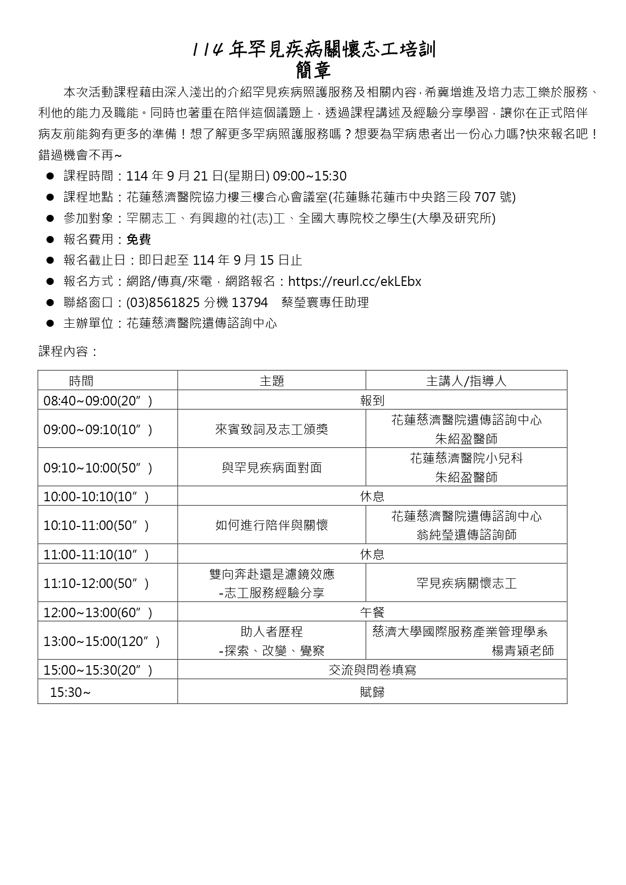 - 課程地點:花蓮慈濟醫院大愛樓三樓-合心會議室