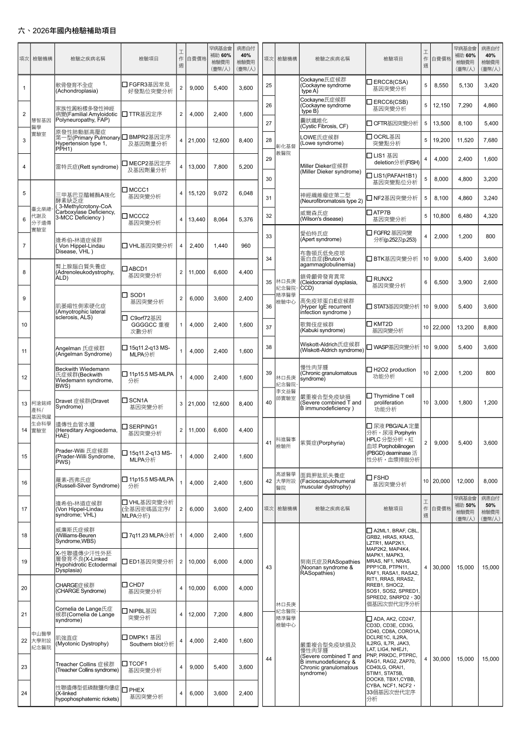 罕見疾病基金會為加強對罕見疾病病友及家屬的照顧,並使得疾病可早期發現早期治療與預防,特針對罕見遺傳疾病檢驗診斷費用給予部分補助。