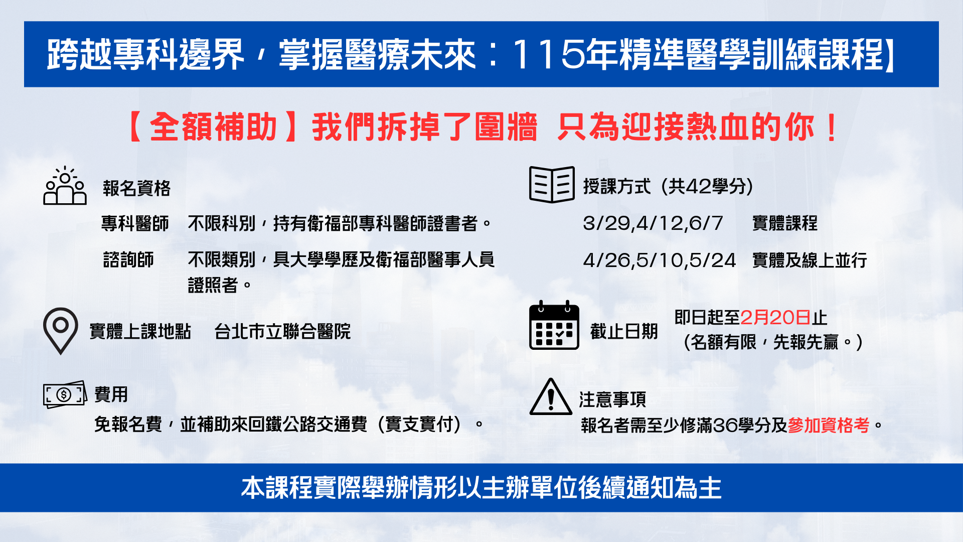 【跨越專科邊界,掌握醫療未來:115年精準醫學訓練課程】