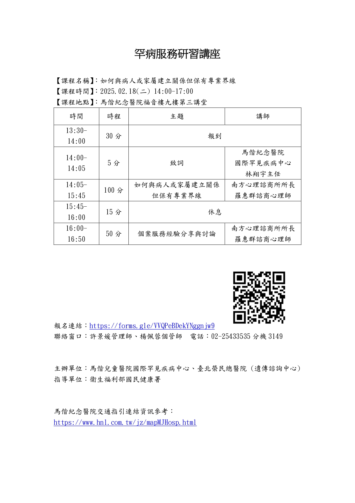 一、馬偕兒童醫院國際罕見疾病中心與臺北榮民總醫院遺傳諮詢中心訂於114年2月18日(星期二)14時00分至17時00分,假馬偕紀念醫院福音樓九樓第三講堂辦理「罕病服務研習講座」,邀請罕病照護計畫工作人員及對罕病照護感興趣者參加。