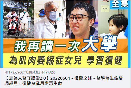 吳明勇,慈大物理治療系應屆畢業生,期許自己用復健醫學專業幫助更多人。重新再讀一次大學,從文轉醫。初心,源自照顧肌肉萎縮症的女兒。