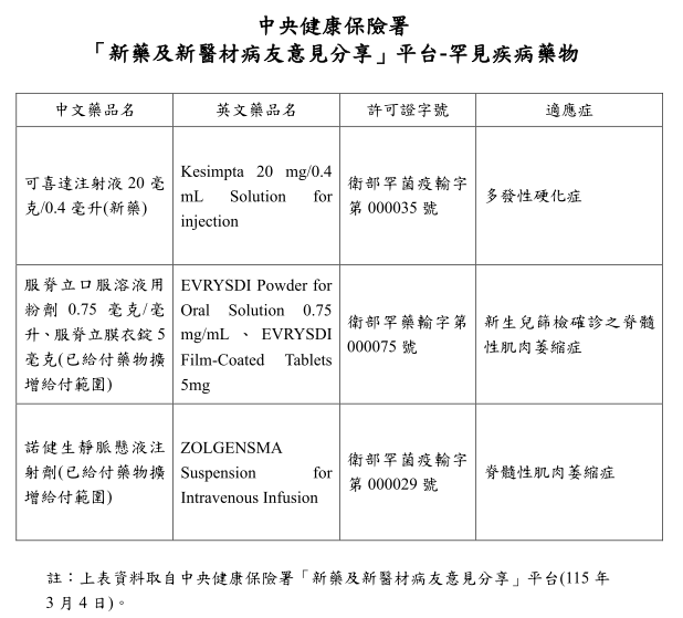 一、中央健康保險署有3項罕見疾病藥物(詳如下表),目前於「新藥及新醫材病友意見分享」平台(https://med.nhi.gov.tw/isPe0000/ISPE0000S01.aspx)蒐集意見,歡迎您分享,讓罕病照護更完善。