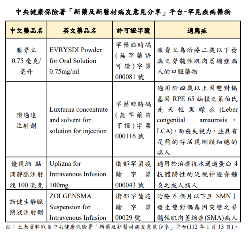 國健署新增4項罕見疾病藥物,目前於中央健康保險署「新藥及新醫材病友意見分享」平台(https://www.nhi.gov.tw/PatientShare/PatientShare.aspx)蒐集意見,歡迎您提供意見分享,讓罕病照護更完善。