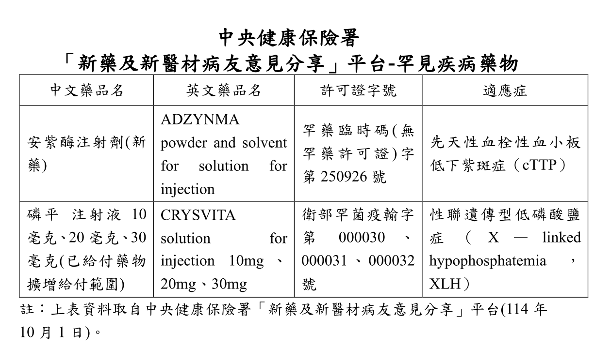 中央健康保險署有2項罕見疾病藥物(詳如下表),目前於「新藥及新醫材病友意見分享」平台(