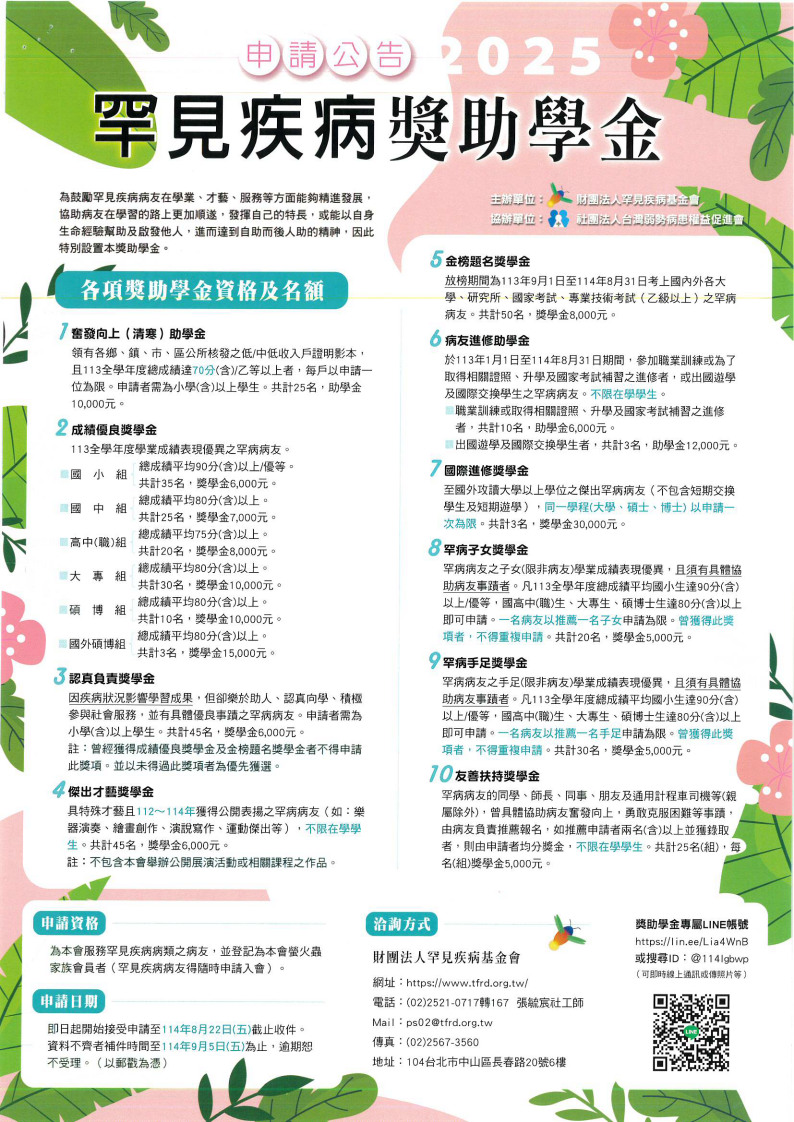 一、罕見疾病基金會為協助有心向學之罕見疾病病患,特辦理2025罕見疾病獎學金,申請項目分為「奮發向上(清寒)助學金」、「成績優良獎學金」、「認真負責獎學金」、「傑出才藝獎學金」、「金榜題名獎學金」、「病友進修助學金」、「國際進修獎學金」、「罕病子女獎學金」和「友善扶持獎學金」等十個項目。
