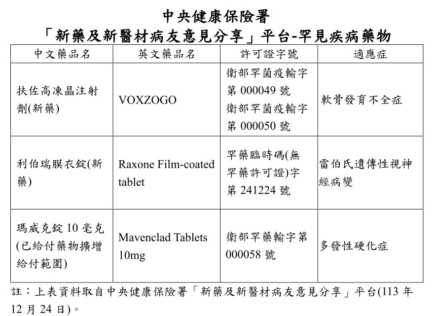 一、中央健康保險署有3項罕見疾病藥物(詳如下表),目前於「新藥及新醫材病友意見分享」平台(https://med.nhi.gov.tw/isPe0000/ISPE0000S01.aspx)蒐集意見,歡迎您分享,讓罕病照護更完善。