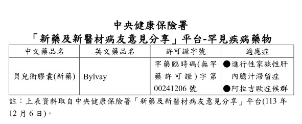 一、中央健康保險署有1項罕見疾病藥物(詳如下表),目前於「新藥及新醫材病友意見分享」平台(https://med.nhi.gov.tw/isPe0000/ISPE0000S01.aspx)蒐集意見,歡迎您分享,讓罕病照護更完善。