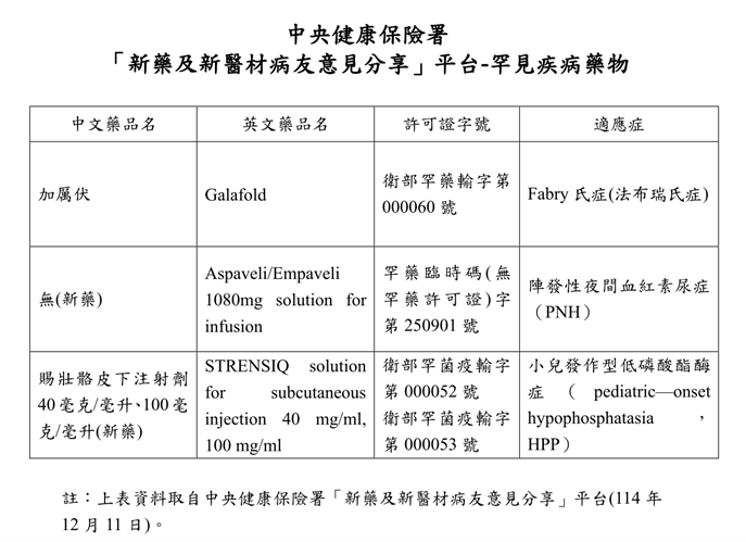一、中央健康保險署有3項罕見疾病藥物(詳如下表),目前於「新藥及新醫材病友意見分享」平台(https://med.nhi.gov.tw/isPe0000/ISPE0000S01.aspx)蒐集意見,歡迎您分享,讓罕病照護更完善。