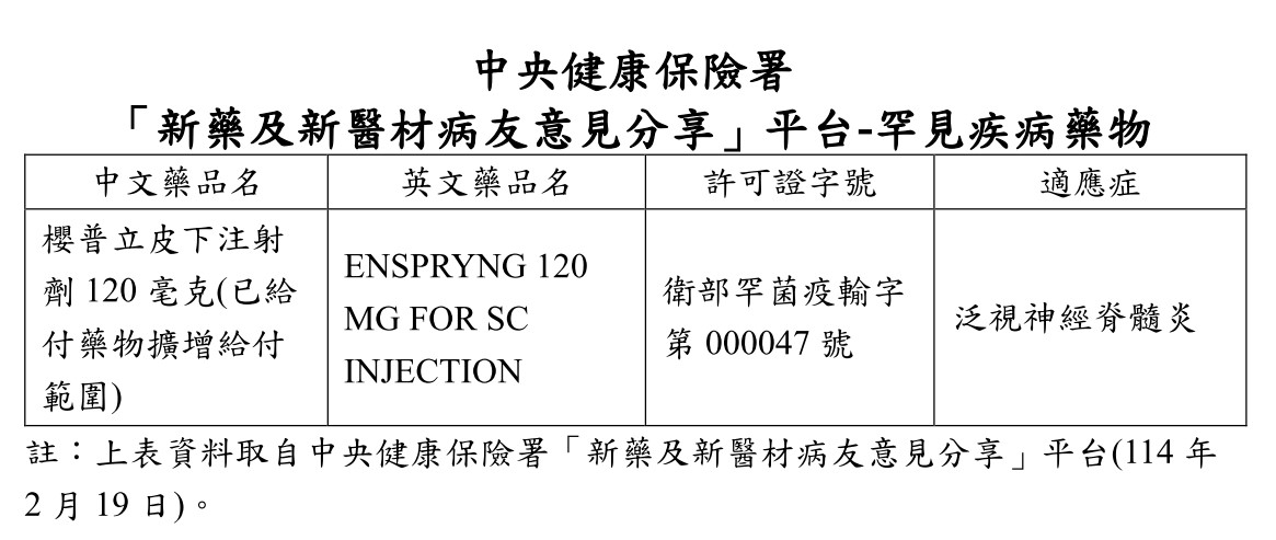 一、中央健康保險署有1項罕見疾病藥物(詳如下表),目前於「新藥及新醫材病友意見分享」平台(https://med.nhi.gov.tw/isPe0000/ISPE0000S01.aspx)蒐集意見,歡迎您分享,讓罕病照護更完善。
