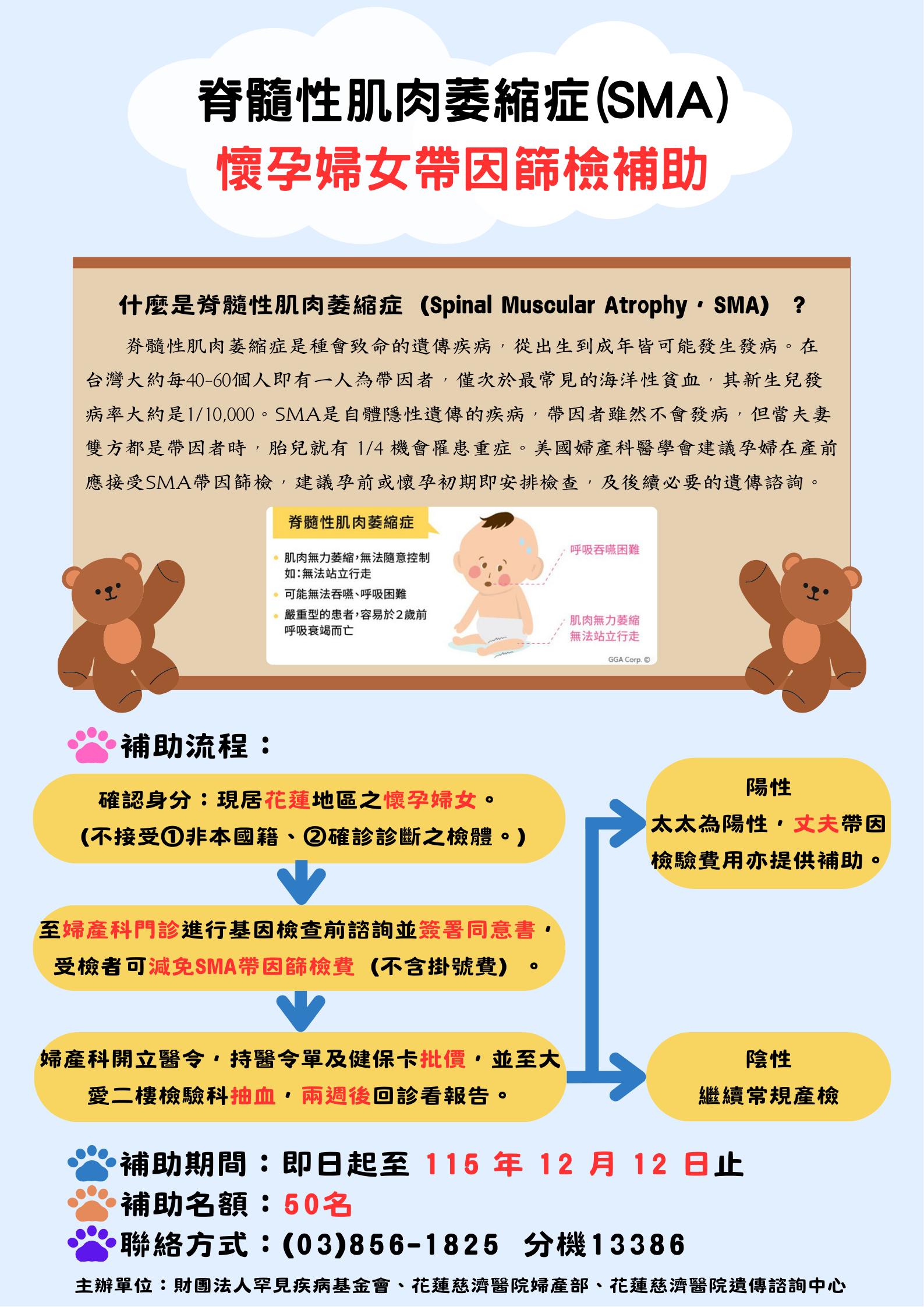 罕見疾病基金會提供偏遠地區脊髓性肌肉萎縮症(SMA)帶因篩檢方案,使居住偏遠地區之懷孕婦女經醫師衛教及評估後安排檢測,得減免一定費用,以減輕經濟負擔。