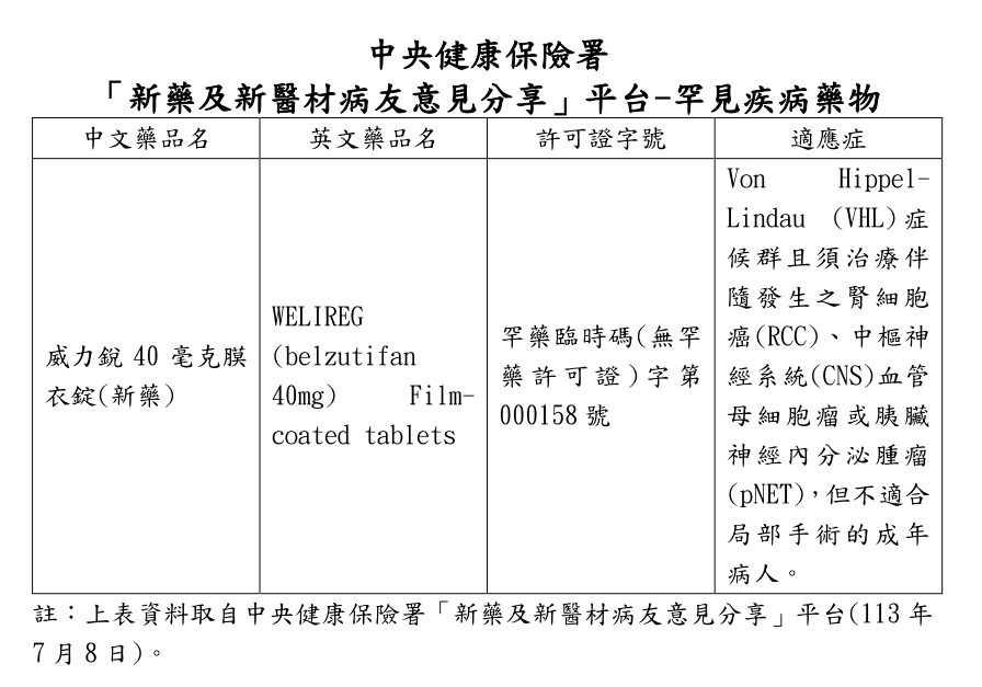 二、、有關旨揭罕見疾病藥物,適應症為:Von Hippel-Lindau (VHL)症候群且須治療伴隨發生之腎細胞癌(RCC)、中樞神經系統(CNS)血管母細胞瘤或胰臟神經內分泌腫瘤(pNET),但不適合局部手術的成年病人。