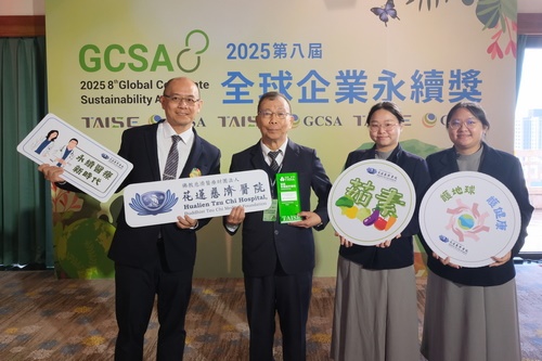 由台灣永續能源研究基金會(TAISE)主辦的「2025 台灣健康永續獎」於 11 月 26 日在圓山大飯店舉行頒獎典禮,花蓮慈濟醫院在 44 家報名醫院中脫穎而出,再度榮獲「台灣永續績優醫院獎」;首本《永續報告書》也獲得「永續報告獎銅級」殊榮,由花蓮慈院吳彬安副院長代表受獎。