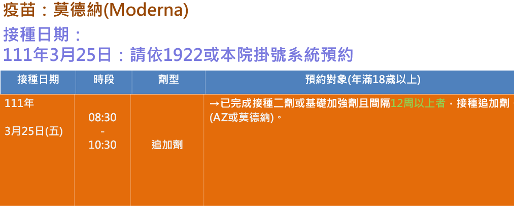 1.適用對象:透過1922公費疫苗預約平台成功之對象、透過本院網路掛號預約成功者(111/3/25)。
