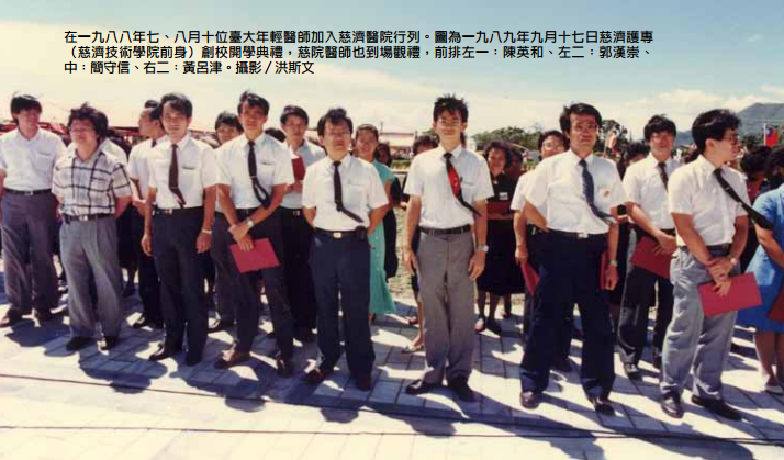 但啟業兩年後,醫院仍深陷醫護人力欠缺的困境,張耀仁、陳信典、陳瑞霞也是最早期前來的醫師之一。一九八八年八月一日,簡守信、郭漢崇、李仁智、趙盛豐、黃呂津等十幾位臺大的年輕醫師同時加入,為慈院注入一道活水清泉;王本榮校長也是在這時前來支援。一九八九年五月王英偉、七月的劉安邦、楊治國到職,及一九九○年七月的于載九、許世祥、許永祥、八月林憲宏,一九九一年七月王志鴻、潘永謙、鄺世通、八月到職的李明哲等,至今都已是在各專業領域深具信譽的醫師了。