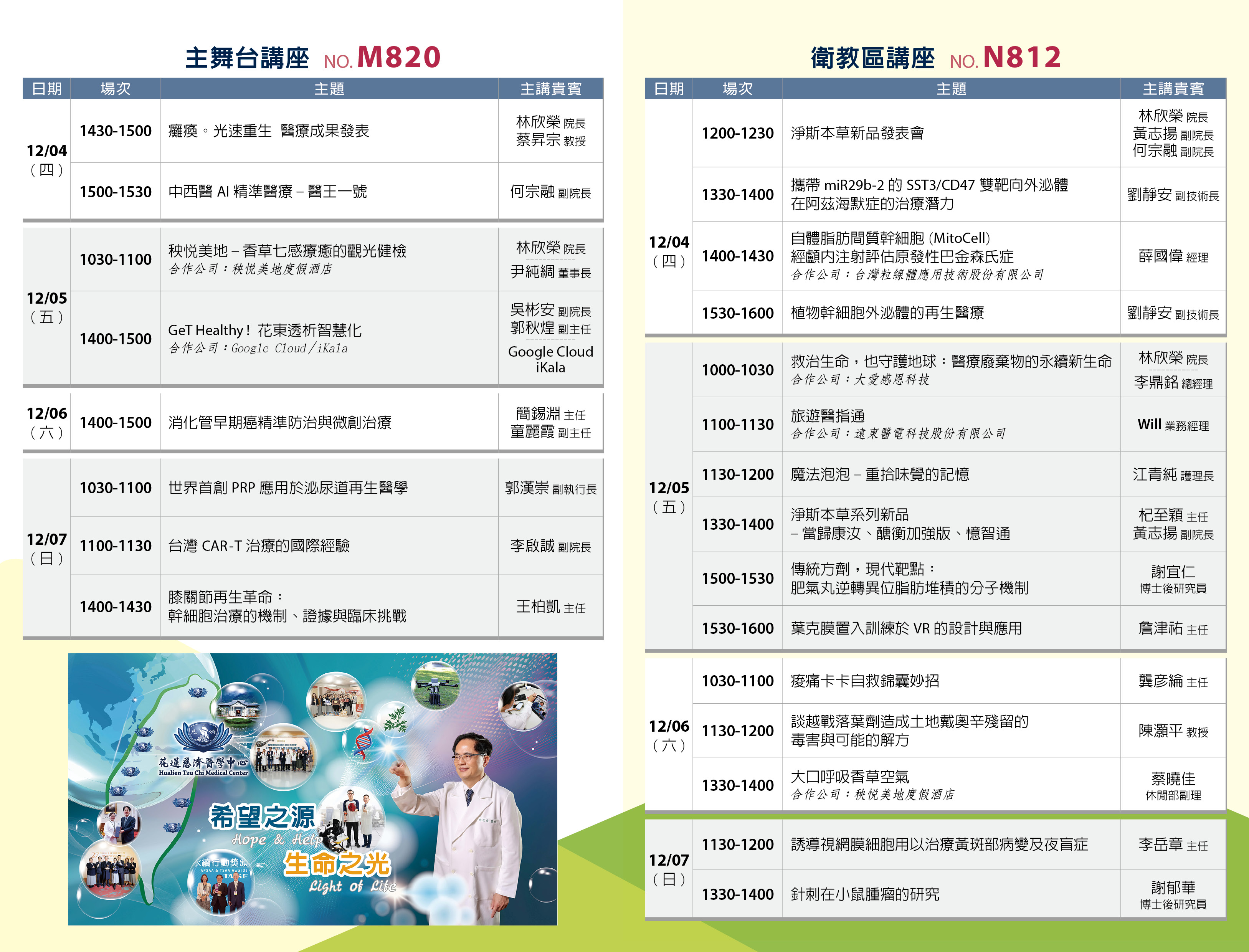 亞太最具規模醫療科技產業盛會,2025年台灣醫療科技展將於12月4日~12月7日舉辦。花蓮慈濟醫學中心展出內容多元,包含特色醫療暨再生醫學(脊髓損傷治療、泌尿道再生醫學、膝關節再生醫學、CAR-T治療、消化管早期癌症防治…)、髓緣生命奇蹟、中西醫精準醫療、淨斯本草、外泌體應用、AI智慧醫療及遠距醫療應用、秀林鄉全人整合照護、護理創新科技、ESG永續發展、光復醫療站紀實、國際醫療與新南向醫衛合作,以及多項創新研發專利技術等。