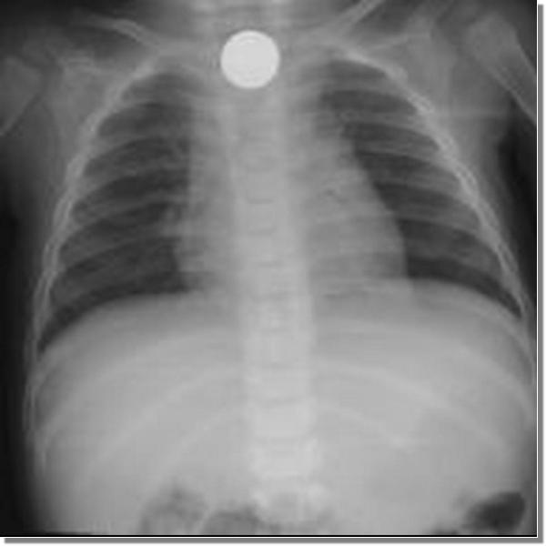 這位三歲的小病人,因為在跟哥哥玩的時候,把哥哥放在桌子上的十元硬幣,拿起來就塞到嘴裡吞進去,哥哥趕緊告訴正在廚房煮飯的媽媽。為了取出十元硬幣,媽媽不僅用湯匙挖病人的喉嚨,還大力的拍打病人的背部,希望引起嘔吐反射或咳嗽反射,讓病人吐出硬幣。