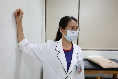 花蓮慈院詹耘婷治療師表示,做任何運動之前,都建議要做暖身運動,在家中可以找一面穩固的牆面,以站立的姿勢將一隻手前臂靠在牆上,與上臂呈直角角度,接著固定上臂將身體轉向另一側。詹耘婷治療師提醒,動作的幅度要依照每個人的身體狀況,量力而為,只要做到感覺有點緊緊的感覺即可,停住五到十秒後換邊,來回五個循環就可以開始進行伸展運動。