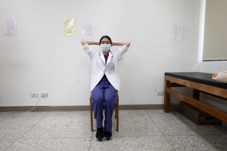 1)坐姿胸廓伸展運動:找一張穩固的椅子,首先將雙手放在頭頸之間護住脖子,接著一邊吐氣一邊向前彎曲身體,停住約五到十秒,再一邊吸氣一邊回到坐姿。這個姿勢可以有效舒緩胸廓及肩頸方面的不適。