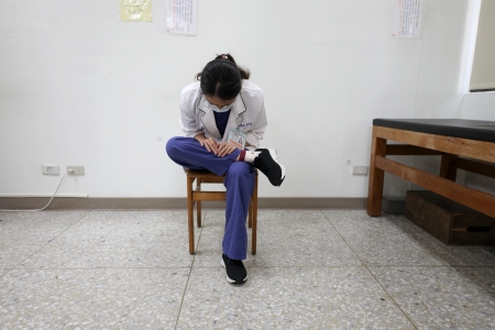 2)坐姿臀部伸展運動:找一張穩固的椅子,先將一隻腳的腳踝放到另一隻腳的膝蓋上,類似翹腳的動作,接著一邊吐氣一邊向前彎曲,停住約五到十秒,再一邊吸氣一邊回到坐姿,然後換邊進行。這個姿勢主要是進行臀部伸展,舒緩連動的下背部疼痛。如果有柔軟度不佳或者關節問題的民眾,也可以將腳踝放在另外一隻腳的小腿上方即可。