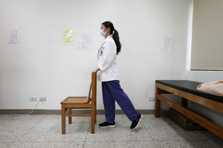 3)站姿後抬腿伸展運動:扶著穩固的椅子或桌子,一隻腳伸直向後抬起,抬起的高度依照個人狀況,停住約五到十秒,接著回到站姿再換另外一隻腳。這個姿勢可以伸展腿部及臀部肌肉,舒緩下肢及下背部。