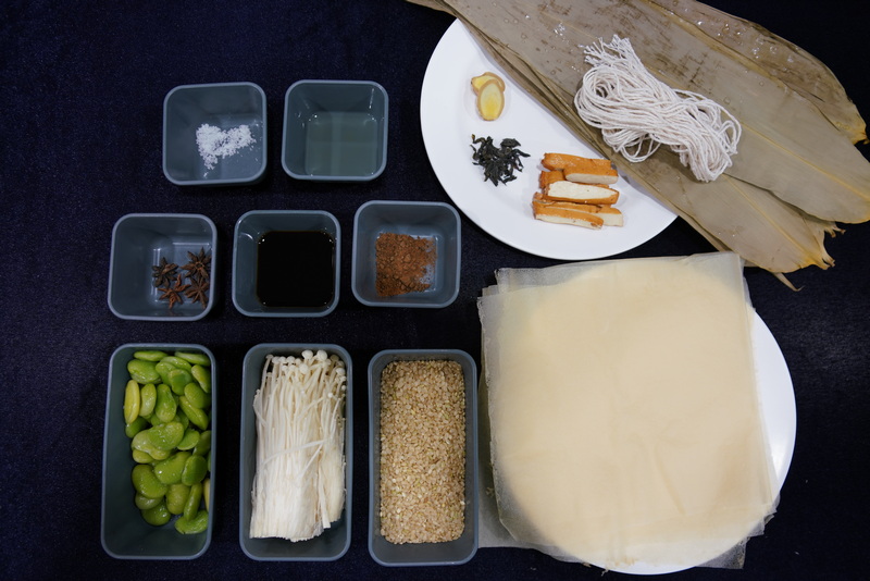 糙米前一日泡水備用,當日將糙米和水以1:1.5的比例(水約270g)放入電鍋煮熟,千張對半剪開後對折;將薑、豆干、金針菇、海帶芽備好,加入沙拉油與鹽等攪拌均勻,放入電鍋蒸熟。並將皇帝豆、八角、醬油、黑糖、水放入鍋中滷至入味,再用粽葉包粽子的手法,放入對折後的千張皮,包入拌飯與皇帝豆後,放入電鍋蒸20分鐘即完成,簡單的步驟,民眾在家也可以輕輕鬆鬆完成。