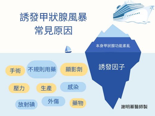 圖說:誘發甲狀腺風暴,常見原因包括不規則用藥、外傷、感染、顯影劑、或壓力過大進而誘發大量分泌甲狀腺素引起。