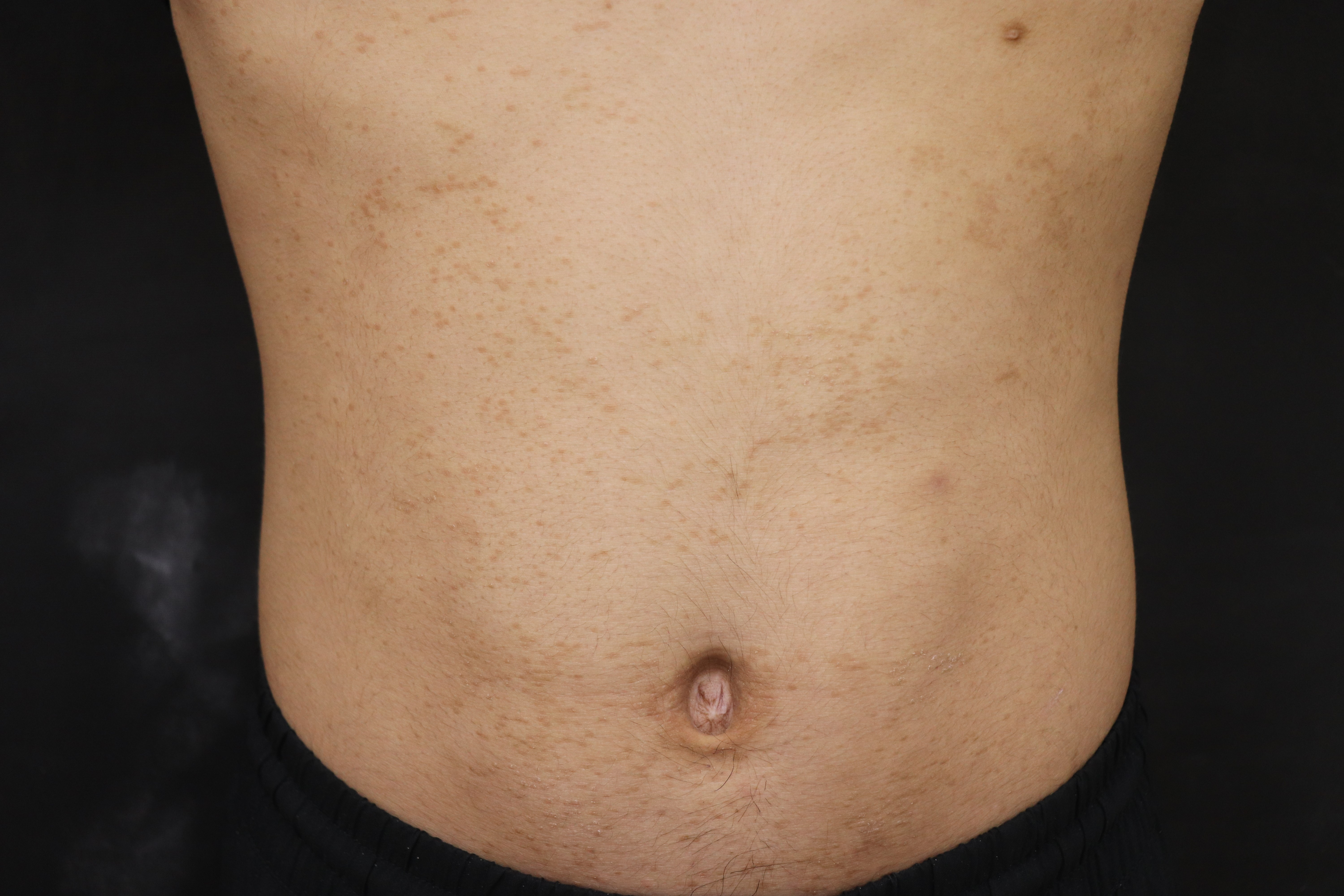 左圖:軀幹有許多輕微隆起的棕色小圓丘疹